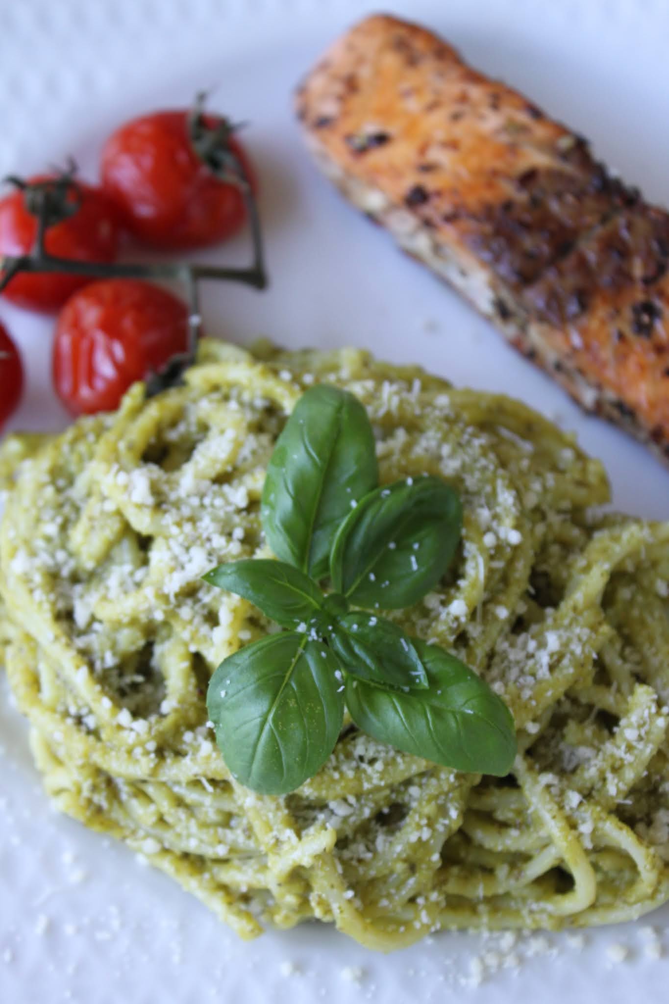 Pesto Spaghetti with Roasted Tomatoes and Grilled Salmon